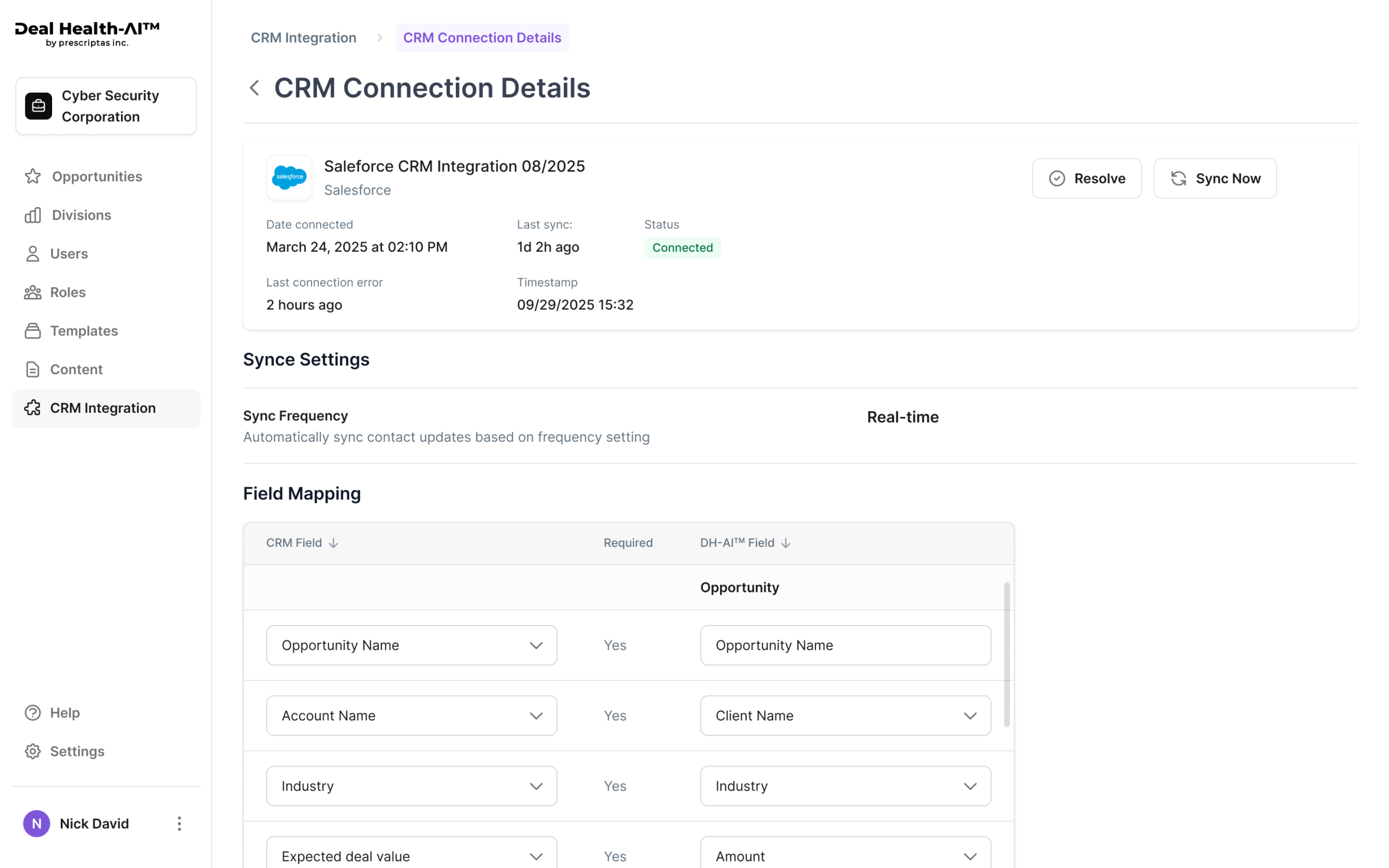 Deal Health-AI™ integrates with Salesforce®, bringing in Accounts, Contacts, and Opportunities through a secure, real-time sync. Standard Salesforce fields map directly into Deal Health-AI, giving reps instant deal visibility without duplicate entry. Salesforce remains the system of record — while Deal Health-AI transforms pipeline data into objective deal assessments, tailored recommendations, and AI-driven forecast confidence that helps every seller sell smarter and win more.