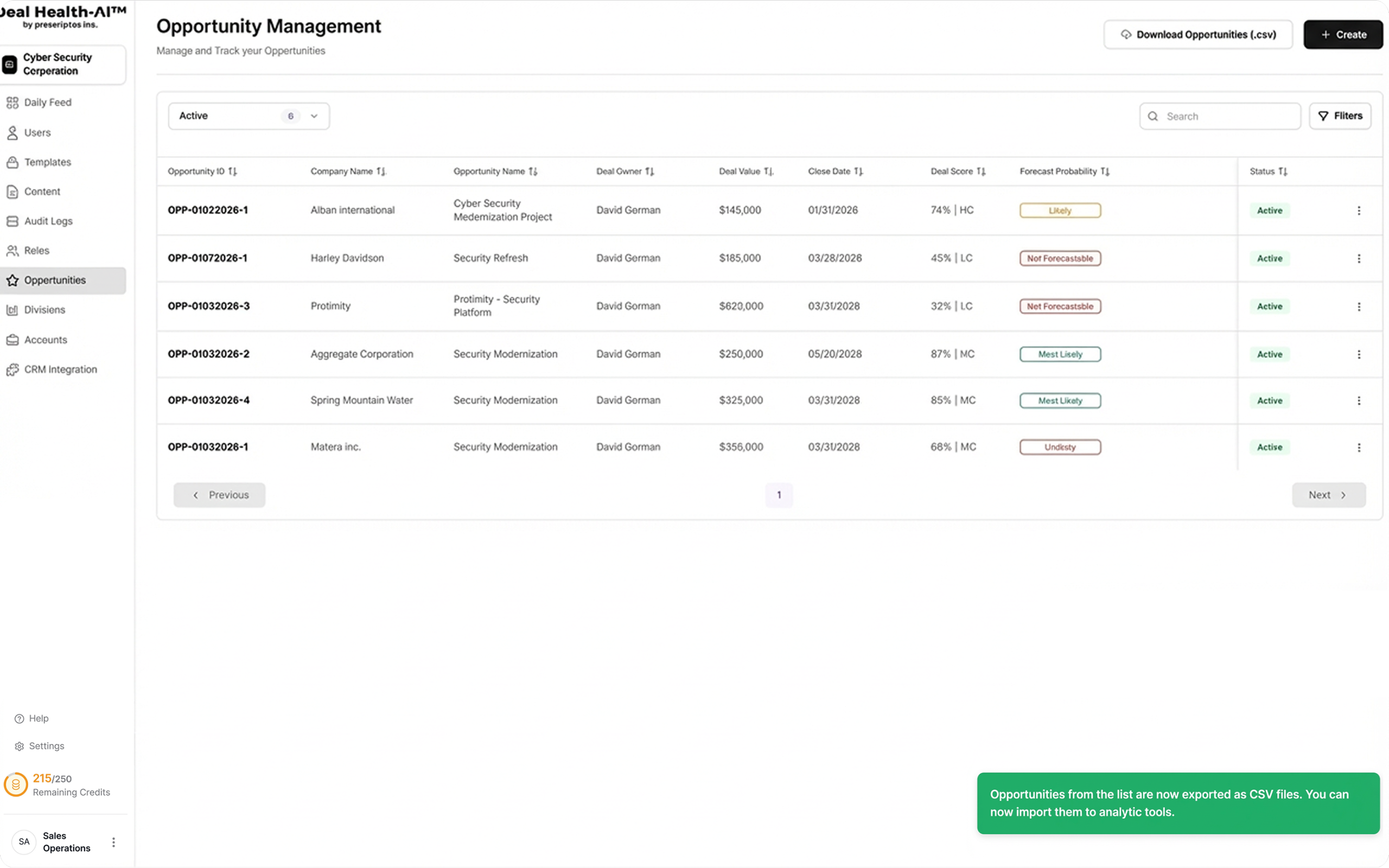 Deal Health-AI™ makes it easy to extend your pipeline intelligence into any analytics or reporting platform. Export client opportunities, deal scores and forecast probabilities as standard CSV files that can be imported into tools such as Microsoft Power BI®, Tableau®, Looker®, Qlik®, SAP Analytics Cloud, Oracle Analytics Cloud, Google Data Studio, or even Excel and custom BI environments. This flexibility gives sales leaders the freedom to blend Deal Health-AI insights with enterprise dashboards and performance reports – without complex integrations or data re-entry.