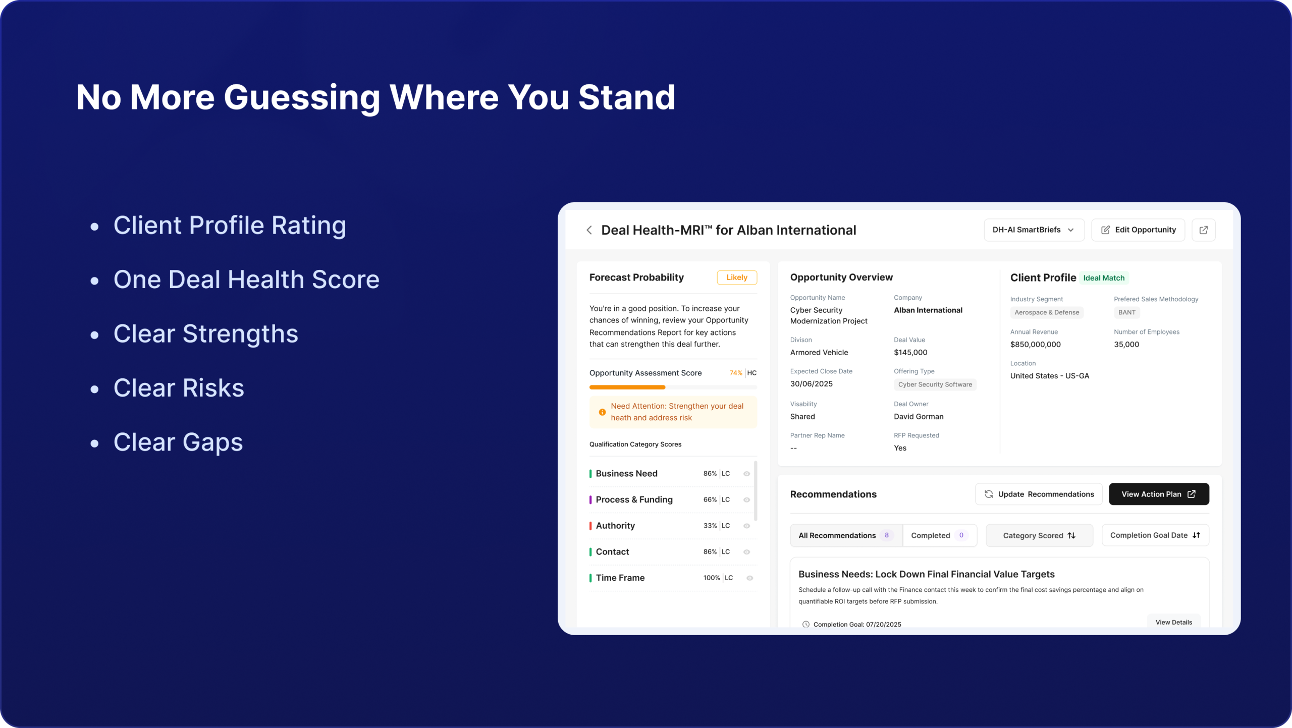 Watch how Deal Health-AI™ spots risks, prescribes next steps & turns your pipeline into a source of confident, winnable deals. It’s fast, it’s clear, and it will change the way you qualify, sell, and close.